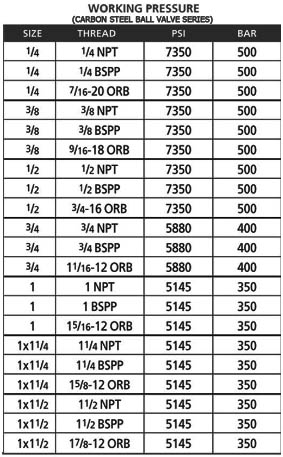 Carbon steel and offered in stainless steel body, full port, block body design with NPT (threaded) or OBR connections. Nickle plated ball with temperature ranges up to 215F. Working pressure up to 5880PSI with optional lock kits, actuation packages, stainless steel upgrades and special seats for higher temperatures. Available in sizes: 1/4", 3/8", 1/2", 3/4" and 1", 1 1/4 and 1 1/2".
